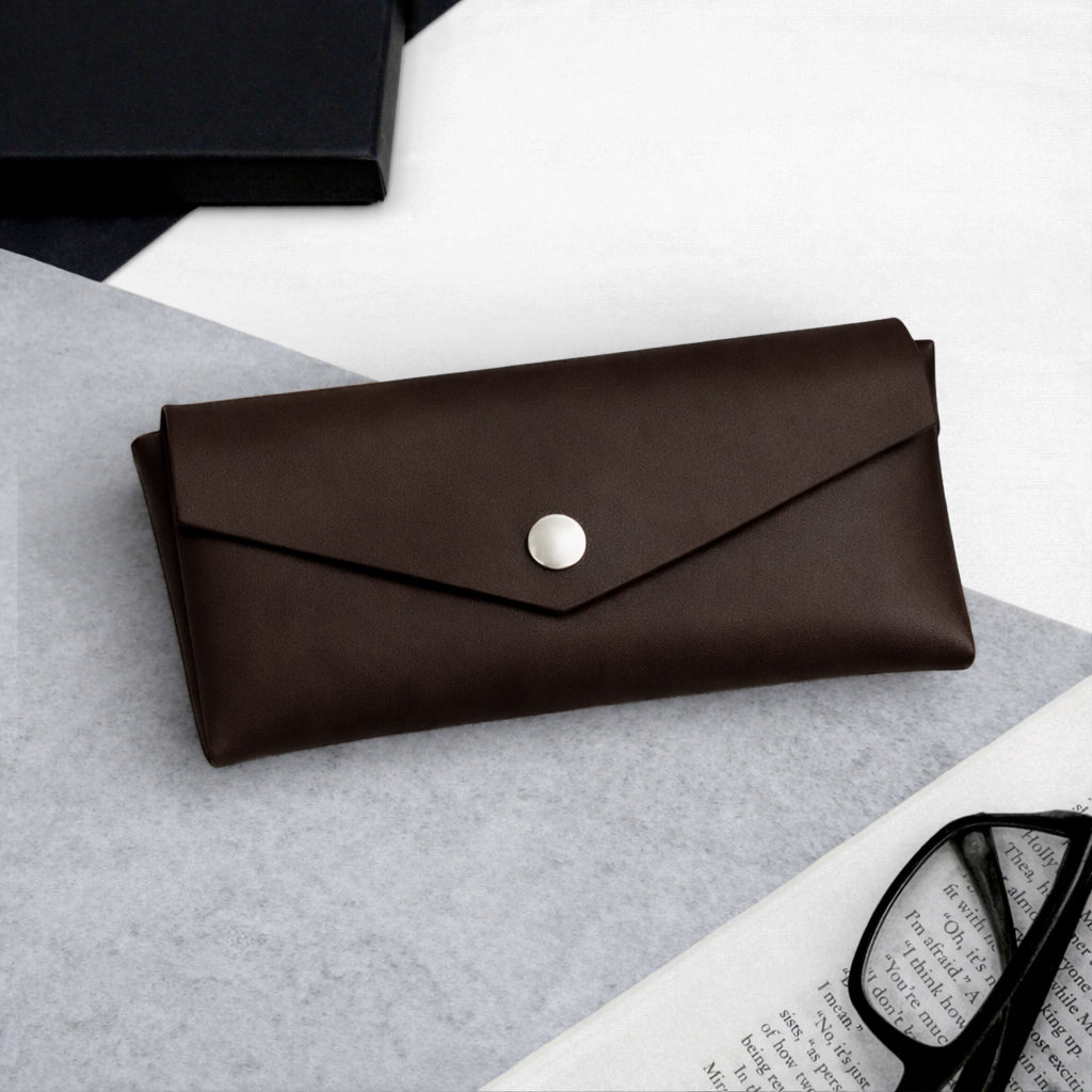 Protect your eyewear in style with this handmade personalised leather glasses case, expertly crafted from thick genuine leather for lasting durability and everyday protection. Designed with a sleek pointed flap and structured hard case construction, this slim leather eyeglasses holder keeps your prescription glasses or sunglasses safe from scratches, pressure, and impact.