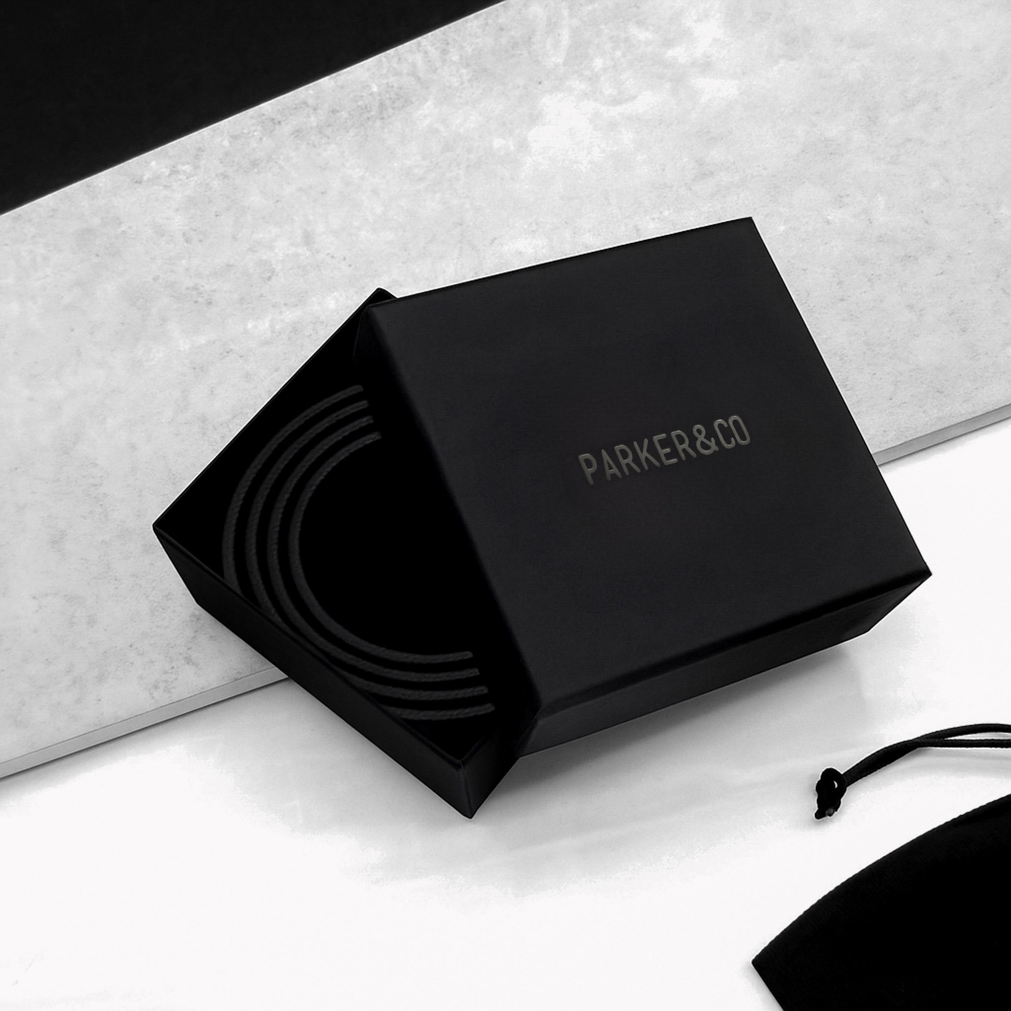 Men’s black branded ‘PARKER&CO’ gift box packaging with the lid half open, revealing a spiralled belt inside, on a grey and white stone surface.